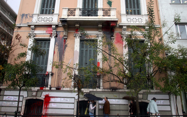 κόκκινες μπογιές στην πρόσοψη και όλους τους τοίχους περιμετρικά του κτιρίου, ενώ έγραψαν συνθήματα υπέρ των μεταναστών όπως